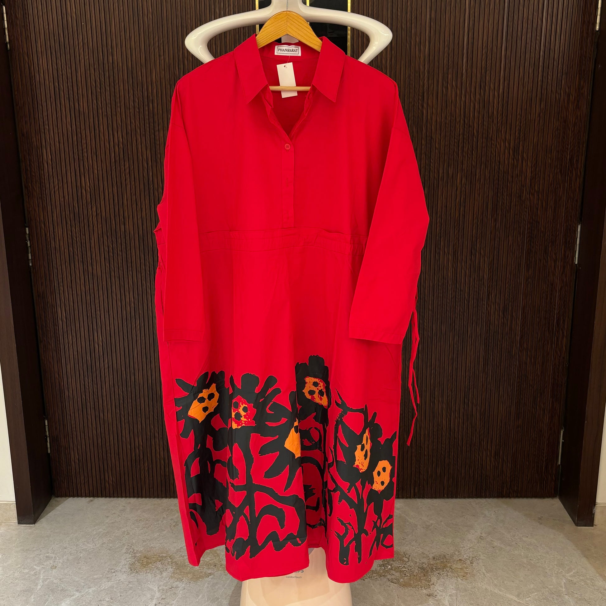 Introducing our charming Red Cotton Dress, featuring an adjustable waist belt for a customised fit and a beautifully printed bottom half. Crafted from soft, breathable cotton, this dress ensures all-day comfort while adding a touch of elegance to your wardrobe. Perfect for any occasion, it combines practicality with stylish design effortlessly.