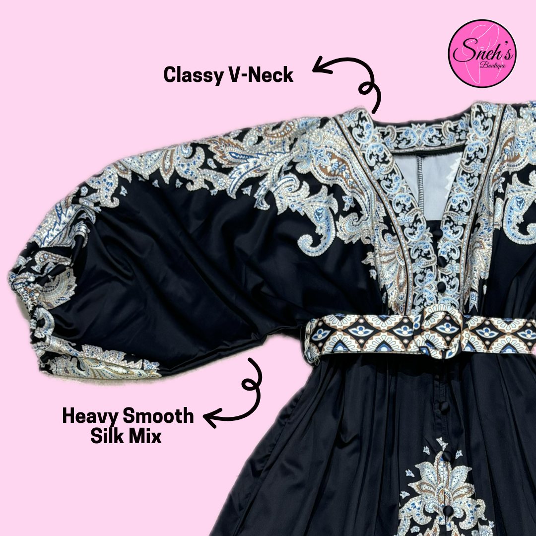Step into timeless elegance with our luxurious Long Black Dress, a masterpiece of fashion crafted from a heavy, smooth silk mix material that drapes beautifully for a dramatic silhouette. The dress features opulent balloon sleeves that add a touch of grandeur, while the rich royal print, inspired by regal motifs, commands attention with its intricate details and striking presence. To accentuate your waist, the dress comes with a contrast print belt, offering a perfect balance of structure and flow. This exquisite piece is designed for those who seek to make a bold, unforgettable statement.