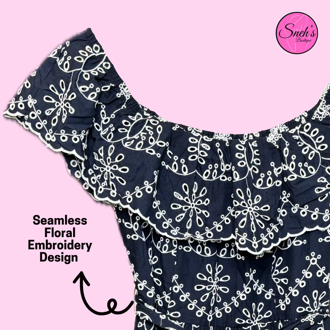 Introducing our stunning Dark Blue Skater Dress, a perfect blend of elegance and playful charm. This off-shoulder dress features exquisite seamless white embroidery that adds a touch of sophistication. The dress is designed with a flattering waist belt, enhancing your silhouette beautifully. The frilled neckline and hemline provide a delightful, feminine touch. Ideal for any occasion, this dress ensures you stand out with grace and style. Embrace timeless fashion with this captivating skater dress.